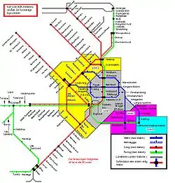 | Лінія | Назва | Колір | Маршрут | Дата відкриття | Довжина | Станції | |