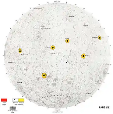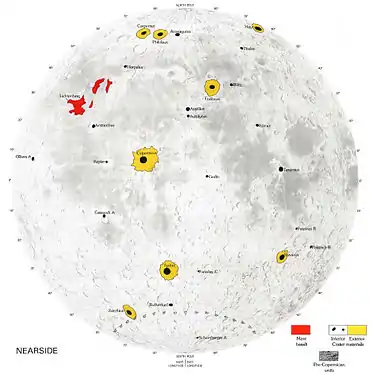 Карта деталей місячної поверхні, що утворилися в коперниківському періоді (Д. Вільгельмс, Геологічна служба США, 1987)[23]. Чорне — кратери, жовте — їх викиди, червоне — моря: