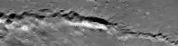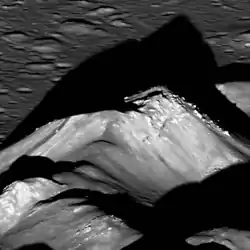 - Знімок західного краю кратера з роздільною здатністю 0,51 м/піксель. Видно осипання порід різної яскравості.