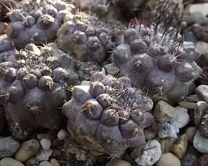 Як правило, ребра виражені слабо і представлені у вигляді великих горбків. Верхівки стебел з густою, короткою і світлою повстю. Радіальні колючки (1-12) 1-3 довжиною см, центральні (1-10) — до 4 см завдовжки. Всі колючки попелясті, коричневі, частіше чорні, прямі або зігнуті.