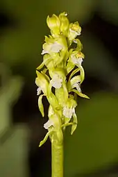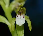 Суцвіття — негуста китиця завдовжки 2-8 см, що складається з 2-12 квіток. Приквітки дуже маленькі, блідо-жовті, плівчасті. Квітконіжки скручені, значно коротші від зав'язі. Квітки завдовжки 4-6 мм, двостатеві, зигоморфні, п'ятичленні. Листочки оцвітини видовжено-ланцетні, 4-7 мм завдовжки, жовтувато- або зеленкувато-білуваті, інколи з червонувато-бурими верхівками. Губа завдовжки 2-3 мм, довгаста або овальна, трилопатева, з невеликими бічними лопатями, білувата з червонуватими смужками і цятками при основі.