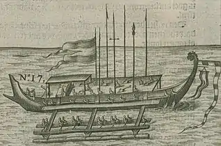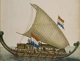 Ілюстрація 1863 року військового корабля кора-кора з вітрилом танджа з Молукк.