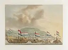 Місцеві Кора-кора і два голландські кораблі у порту Гамме Ламме, столиці Тернате.