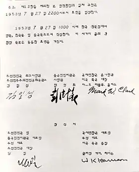 Корейська угода про перемир'я (кор. 한국휴전협정, кит. 朝鮮停戰協定) — перемир'я, яке призвело до повного припинення бойових дій під час Корейської війни. Договір підписали генерал-лейтенант армії США Вільям Гаррісон молодший, який представляв командування ООН, північнокорейський генерал Нам Іл, який представляв Корейську народну армію, і Китайську народну добровольчу армію.[1] Перемир'я було підписано 27 липня 1953 року, і було покликане "забезпечити повне припинення бойових дій та всіх актів збройних сил в Кореї до досягнення остаточного мирного врегулювання".[2]