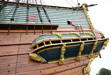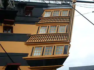 Галерея розташовувалася ззаду і з боків кормової надбудови. Бокове розташування кінців галереї забезпечувало добрий огляд уперед: з неї було видно майже весь горизонт і вітрила свого корабля. На старих тридекових кораблях влаштовувалося по три таких галереї: одна над однією, на рівні деків. Галерея видавалася назовні приблизно на 1 м, але її загальна ширина становила близько 2 м: вона частково розміщалася в корпусі, відділяючись від сусідніх приміщень поздовжніми перебірками. У бортових кінцях галереї (якщо їх було кілька, то на нижній) розташовувалися туалети для офіцерів[1] (відхожі місця для матросів розташовувалися на гальюні). Бортові частини галерей кріпилися на кварторпісах (від англ. quarter pieces — «задньобокові штуки») — опорах, часто прикрашених фігурами[2].