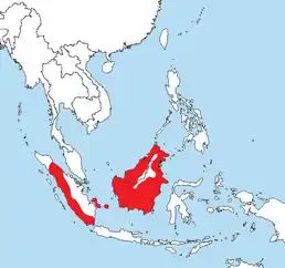 Вид поширений на Суматрі, Калімантані та дрібних сусідніх островах. Мешкає у тропічних та субтропічних дощових лісах і мангрових лісах.