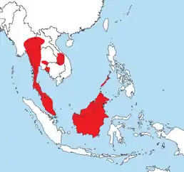 Вид поширений в Індокитаї, Таїланді, Малайзії, на Калімантані та Палавані. Живе у тропічних і субтропічних дощових лісах.[2]