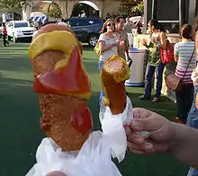 Версія для сніданку складається з сосисок у фритюрі в млинцях.