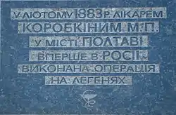 На південному фасаді хірургічного корпусу клінічної лікарні ім. М. В. Скліфосовського на честь Коробкіна М. П. встановлена меморіальна дошка. Дошка — лабрадорит, відкрита 1983 року.