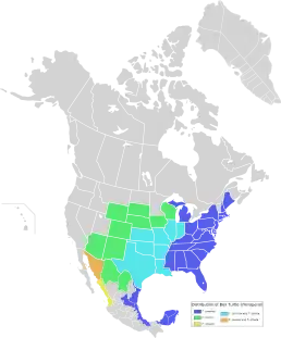 ![]() Поширення прикрашеної коробчастої черепахи (позначено зеленим, синім та помаранчевим кольором) | ||||||||||||||||||||||