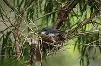 Сезон розмноження триває з кінця літа до початку зими, часто за сезон вилупляються два виводки. Гніздо невелике, чашоподібної форми, зроблене з сухої кори, палого листя і павутини. Зазвичай воно розташовується в густому чагарнику поблизу джерел води[15]. В кладці два яйця блідо-оливкового або темно-зеленого кольору, часто з темними плямками, розмірами 16x21 мм[16]. Інкубація триває 16-17 днів, пташенята покидають гніздо через два тижні після вилуплення.