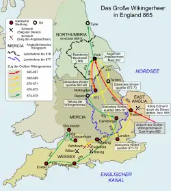 У 864 або 865 році король Елла II переміг велике військо Рагнара Лодброка, якого було схоплено та страчено. У відповідь сини останнього Івар та Гальфдан зібрали так зване Велике поганське військо, яке висадилося у королівстві Східна Англа, король якої відкупився від данів кіньми. Останніх було застосовано для суходільного наступу на Нортумбрію яку було переможено у 866 році. Згодом дани атакували та пограбували Мерсію й Східну Англію.