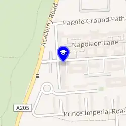 | Складається з | Main Building, Royal Military Academyd, West Lodge, Royal Military Academyd, East Lodge, Royal Military Academyd, Royal Military Academy North West Gated, Royal Military Academy South West Gated, Royal Military Academy East Gatesd, Pillar Box Within The Royal Military Academy Main Building Groundsd і Church of St Michael and All Angels, Old Royal Military Academyd |