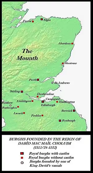 До правління Давида I у Шотландії не було міст. Найближчими до поняття «місто» були території навколо великих монастирів таких, як Данкельд і Сент-Ендрюс та регіонального значення укріплень, де концентрація населення була вищою, ніж в середньому. Шотландія, принаймні поза Лотіаном, була заселена розсіяними селами. Давид I заснував перші міста із самоврядуванням (англ. Burghs) в Шотландії, спочатку тільки на, в основному англомовному, Середньому Лотіані[1]. До найбільш ранніх таких типів поселення відносяться засновані в 1124 Бервік (англ. Berwick) і Роксбург (англ. Roxburgh). Однак, до 1130 року, Давид I заснував на гельській території такі міста із самоврядуванням: Стерлінг, Данфермлайн, Перт і Скуне, а також Единбург. Завоювання графства Морей в тому ж році привезло до створення подібних міст в Елгіні і Форесі. Перш, ніж Давид I помер, Сент-Ендрюс, Монтроз, і Абердин стали містами із самоврядуванням. За правління Малкольма IV і Вільгельм I, список міст із самоврядуванням поповнили такі міста, як Інвернесс, Бенф, Каллен, Ольдирн, Нерн, Інверурі, Кінтор, Бріхін, Форфар, Арброт, Данді, Ланарк, Дамфріс і Ер (єдине на західному узбережжі). В Лотіані такі типи поселень також з'явилися в Хаддінгтоні, Лейті і Піблсі. До 1210 року існувало 40 міст із самоврядуванням в Шотландському королівстві. Роземаркі, Дінгуол і Кромарті також належали до такого типу міст до Шотландської війни за незалежність XIII — XIV століть.