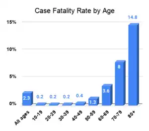 Виявлені показники летальності — 1,0 % серед дорослих у віці 50–59 років, 3,5 % серед 60–69 років, 12,8 % серед 70–79 років і 20,2 % серед 80 років і старше. Серед тяжкохворих, як повідомляється, летальність досягає 50 % серед дорослих у віці 40–49 років і 87,5–100 % серед тих, хто старше 70 років. Точний рівень загальної летальності в світі невідомий — хоча деякі моделі, що містять легкі та безсимптомні випадки, оцінюють його у 0,5-1 %[82].