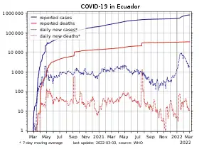 23 березня уряд Еквадору повідомив про 981 випадок коронавірусної хвороби в країні, 18 з яких померли.[35] 24 березня еквадорська поліція розпочала блокування ринків у країні, щоб обмежити скупчення людей.[36] Удень 30 березня новий міністр охорони здоров'я країни Хуан Карлос Севальйос оголосив, що в Еквадорі вже 54 хворих одужали після коронавірусної хвороби.[37]