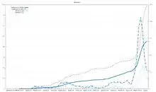 ![]() Дані ВООЗ щодо захворювання на Мальдівах. Товста суцільна лінія — всі підтверджені випадки, товстий пунктир — згладжена крива збільшення, тонка переривчаста лінія — загальні смерті, тонкий точковий пунктир — згладжена крива збільшення смертей (станом на 4 листопада 2020) | |