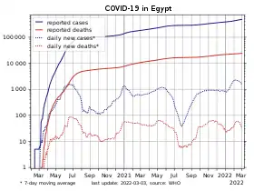Фахівці з інфекційних захворювань Університету Торонто, які вивчали невідповідність між офіційними та ймовірними показниками зараження у Єгипті, оцінили, що станом на 15 березня розмір спалаху в Єгипті склав від 6270 до 45070 випадків зараження. Єгипетський уряд заперечив ці цифри і почав заарештовувати людей, котрі розповсюджують дані про більше поширення пандемії, ніж зазначається в офіційних джерелах.[24]