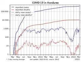 26 березня — підтверджено першу смерть від вірусу. Жертвою став 60-річний пацієнт у Віллануеві, у районі Кортеса, що страждав від гіпертонії та ішемічної хвороби серця[3].