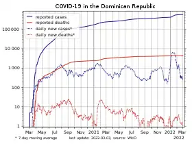 1 березня підтверджено перший випадок коронавірусної хвороби в країні, який одночасно став першим випадком коронавірусної хвороби на Карибах. Першим хворим став 62-річний громадянин Італії, який прибув до країни 22 лютого, та захворів 24 лютого, після чого його доправили до військового госпіталю Рамон-Лара з курортного містечка Байягібе.[2] 6 березня підтверджено другий випадок хвороби в країні в туриста з Канади. який також відпочивав у Байягібе.[3] 8 березня коронавірусну хворобу підтверджено в 3 громадян Домініканської Республіки, які повернулись з туристичної поїздки до Італії.[4] 14 березня міністр охорони здоров'я країни Рафаель Санчес Карденас підтвердив 6 нових випадків хвороби в країні. Усі ці хворі виїздили за межі країни протягом останніх 14 днів.[5]