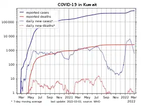 26 березня міністерство охорони здоров'я Кувейту повідомило про виявлення 16 нових випадків коронавірусної хвороби, всі з них перед цим відвідували Іран.[14] До кінця дня в країні зареєстровано 25 випадків хвороби.