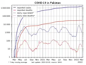 25 березня повідомлено про введення низки обмежувальних заходів на території столичної території Ісламабад. До них входили закриття амбулаторних лікувальних закладів та відділень лікарень, повну заборону пересування міського та міжміського транспорту, а також зібрань громадян як у приміщенні, так і у відкритих місцях.[74] У цей день оголошено про три одужання та про восьму смерть у країні. Кількість випадків коронавірусної хвороби в країні перевищила позначку в 1000 випадків, та склала 1057 випадків.[75] 26 березня в Пакистані виявлено 140 нових випадків коронавірусної хвороби. У провінції Пенджаб помер ще один хворий, після чого число померлих від коронавірусної хвороби в країні зросло до 9. Загальна кількість випадків досягла позначки в 1197 хворих, ще двоє людей в країні одужали.[76]
