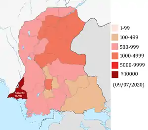 Найбільше хворих зареєстровано у провінції Сінд — близько 134 000, у цій провінції також зареєстровано найбільшу кількість смертей унаслідок COVID-19 — близько 2500 на середину березня 2021 року. У країні оголошений загальнонаціональний локдаун з 1 квітня до 9 травня[4], який пізніше двічі продовжувався.[5] Після завершення дії локдауну вихід з обмежень проходить поетапно.[6]