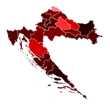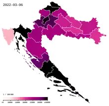 ![]() Захворюваність COVID-19 у Хорватії за повітами на 100 тис. Осіб | |
