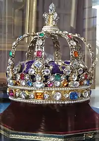 - Золота Корона, що являла собою золотий обід з оксамитовою шапкою, прикрашеною перлами, над якою чотири опори підтримували геральдичну лілію (закрита корона). На церемонії коронації єпископ розташовував цю корону над головою короля, і в цьому положенні її підтримували всі пери королівства або їх представники, що символізувало факт передачі повної влади.
