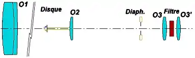 Схема коронографа Ліо приведена на малюнку. Головний об'єктив О1 будує зображення Сонця на штучному «місяці», який є полірованим металевим конусом, орієнтованим вершиною до об'єктиву. Діаметр основи конуса трохи більше діаметра зображення Сонця. Штучний «місяць» М відбиває сонячне світло так, що воно не потрапляє назад на об'єктив. Безпосередньо за «місяцем» розташована досить суттєва деталь коронографа - лінза поля O2 з фокусною відстанню приблизно в 10 разів меншою, ніж у головного об'єктива. Лінза поля будує зображення головного об'єктиву на діафрагмі L, екранує яскраве кільце, утворене дифрагованим світлом. За діафрагмою L розташований об'єктив О3, який «переносить» зображення наближених до Сонця ділянок неба і корони на фотографічну платівку або щілину спектрографа. В площині діафрагми можна також розташувати невеликі екранчики, що закривають світлі точки, що виникають внаслідок розсіювання на існуючих неоднорідностях і подряпинах. Ліо в своїй схемі розташовував у центрі діафрагми невеликий екран, який закривав яскраву крапку, що утворюється при відбиванні сонячного світла від поверхонь об'єктива. Вимоги щодо лінзи поля та перебудовуючого об'єктиву, не високі. Для гарного об'єктива практично все розсіяне світло визначається дифракційним кільцем, зумовлена ним інтенсивність фону в фокальній площині коронографа на відстані 0,05 - 0,1 Rс від краю зображення «місяця» складає приблизно 1/1000 яскравості Сонця. За умови особливо ретельної підготовки 10-сантиметрового об'єктива Ліо вдавалося знижувати яскравість фону від розсіяного світла до 1-2 мільйонних частки яскравості Сонця. Кількість розсіяного світла залежить від діаметра об'єктива (очевидно, що вона росте трохи швидше, ніж квадрат діаметра).