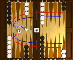 Числа на кожній кісточці показують, на скільки пунктів гравець повинен пересунути свої шашки. Шашки завжди рухаються лише в одному напрямку, від пунктів з великими номерами до пунктів з меншими. Для білих — проти годинникової стрілки. Для чорних — за годинниковою стрілкою. При цьому застосовуються наступні правила: шашка може рухатися тільки на відкритий пункт, тобто на такий, який не зайнятий двома або більше шашками протилежного кольору.