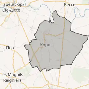 - Розташування муніципалітету Корп на мапі Франції та сусідні муніципалітети