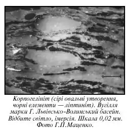 У залежності від орієнтації форма покладів може бути сферичною, овальною або продовгувастою. Розмір варіює. Утворення корпогелініту можуть досягати в довжину 1—10 мм. Його границі звичайно носять рівний характер, іноді кутасті. Рідко корпогелініт містить вакуоли різного розміру. Він має більш високий, ніж інші попутні вітринітові мацерали, рівень відбивної здатності. Травлення може виявити або зробити більш видимим корпогелініт в складі колотелініту або колодетриніту. Інтенсивність флуоресценції К. слабша, ніж у попутних мацералів колотелініту і колодетриніту, або ж відсутня. У складі вугілля і осадових порід пізнього мезозою і кайнозою К. звичайно є похідним корпогумініту (флобафініту).