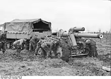![]() Артилерійська обслуга 150-мм важкої польової гаубиці sFH 18 на артилерійському тягачі RSO витягує гаубицю з грязюки. Україна. Березень 1944 | |