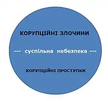 Відповідно до ст. 1 Закону України «Про запобігання корупції» (Відомості Верховної Ради (ВВР), 2014, № 49, ст.2056) «корупційне правопорушення — діяння, що містить ознаки корупції, вчинене особою, зазначеною у частині першій статті 3 цього Закону, за яке законом встановлено кримінальну, дисциплінарну та/або цивільно-правову відповідальність».