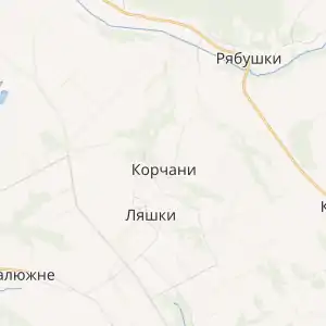 Село Корчани знаходиться за 2,5 км від лівого берега річки Вільшанка. Примикає до села Ляшки, на відстані 1 км розташовані села Тригуби і Вершина. По селу протікає пересихаючий струмок з загатою.