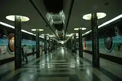 Архітектурне оздоблення станції присвячено темі космосу. Інтер'єр прикрашено блакитними керамічними медальйонами із зображеннями Улугбека, Ікара, Валентини Терешкової, Юрія Гагаріна тощо. Стеля, нагадує Чумацький шлях, на якому світяться скляні зірочки. Колійні стіни платформи від підлоги до стелі по всій довжині платформи поступово переходять від блакитного кольору до темно-синього, нагадуючи атмосферу Землі. Круглі колони платформи покриті склом, також металом, гранітом і мармуром оброблені вестибюлі станції, оздобленн вестибюлів виконана, як і станція, на тему освоєння космосу.