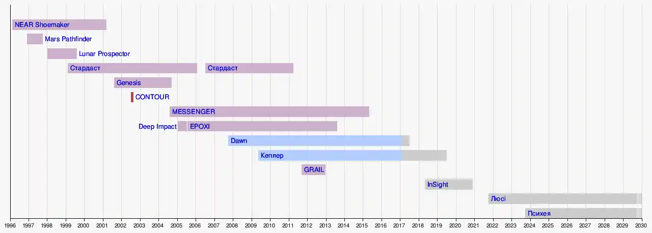 - NEAR Shoemaker (місія № 1) — місія з вивчення астероїда 433 Ерос. Запущена 17 лютого 1996 року, апарат вийшов на орбіту Ероса у 2000 і успішно здійснив посадку рік потому. Були успішно здійснені головна і розширена місії.