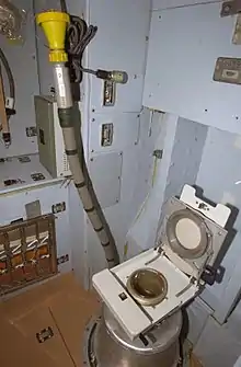 Космічні туалети мають офіційну назву «Waste and Hygiene Compartments». Після всмоктування всі відходи розщеплюють на кисень і воду, ці складові рідких відходів людини запускають в замкнутий цикл орбітальної станції унітаз на ОС призначений як для чоловіків, так і для жінок — виглядає точно так само, як на Землі, але має ряд конструктивних особливостей. Унітаз забезпечений фіксаторами для ніг і стегон, в нього вмонтовані потужні повітряні насоси. Космонавт пристібається спеціальним пружинним кріпленням до сидіння унітазу, потім включає потужний вентилятор і відкриває всмоктувальний отвір, куди повітряний потік забирає всі відходи.