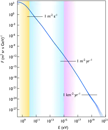 Вимірювання енергетичних напрямків і напрямків надходження первинних космічних променів надвисокої енергії методами відбору проб густини та швидкого хронометражу вперше були проведені в 1954 році членами Космічної промінь групи Россі в Массачусетському технологічному інституті. В експерименті було використано одинадцять сцинтиляційних детекторів, розташованих у колі діаметром 460 метрів на майданчику станції Агассіс в обсерваторії Гарвардського коледжу . З цієї роботи та багатьох інших експериментів, проведених у всьому світі, зараз відомо, що енергетичний спектр первинних космічних променів виходить за межі 10 20 eV. Наразі величезний експеримент проводиться на майданчику в пампасах Аргентини міжнародним консорціумом фізиків. Проєкт був першим у чолі з Джеймсом Кронін, переможець 1980 Нобелівської премії з фізики з університету Чикаго, і Алан Уотсон з Університету Лідса, а пізніше іншими вченими міжнародного рівня - П'єром Оже. Їх мета - дослідити властивості та напрямки прибуття первинних космічних променів найвищої енергії. Очікується, що результати матимуть важливе значення для фізики частинок та космології через теорію Грейзен-Зацепін-Кузьмін, яка обмежує енергію космічних променів на великі відстані (близько 160 мільйонів світлових років), що виникає вище 10 20 еВ через взаємодію із залишковими фотонами. В даний час обсерваторія П'єра Оже проходить модернізацію, щоб підвищити її точність і знайти докази для ще не підтвердженого походження найбільш енергетичних космічних променів.