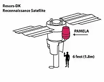 PAMELA ( корисне навантаження для вивчення антиматерії та астрофізики легких ядер ) - це модуль дослідження космічних променів, приєднаний до супутника навколо орбіти Землі. PAMELA був запущений 15 червня 2006 року і був першим експериментом на базі супутників, присвяченим виявленню космічних променів, з особливим акцентом на компонент антиматерії у вигляді позитронів та антипротонів. Інші завдання включали тривалий моніторинг сонячної модуляції космічних променів, вимірювання енергетичних частинок від Сонця, високоенергетичних частинок у магнітосфері Землі. Також можна було сподіватися, що він може виявити докази знищення темної речовини[22]. Проєкт PAMELA був припинений в 2016 році[23] разом з його супутником Resurs-DK1 .