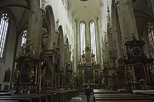 На східному боці костел завершений головоною навою й короткою вівтарною частиною, по боках — капели. Бічні проходи зберегли своє готичне ребристе склепіння. Храм має чотири готичні портали, 2 на західному фасаді, по одному на північному й південному. Дві вежі костелу доповнені вишуканими пізньоготичними восьмикутними шоломами. Світло до костелу проникає через ряд готичних видовжених угору віконниць, оздоблених кам'яним різьбленням.