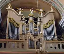 Орган на хорах костьолу належить авторству віденського органобудівника Й. Гессе (J. Hesse). Інший відомий будівник органів з Відня — Карл Гессе, 1808—1882), який у 1858 році збудував орган у Кам'янець-Подільському (першим інструмент Карла Гессе у цьому регіоні). Будь-які дані про родинні зв'язки Карла Гессе та Й. Гессе відсутні[джерело?]. Авторство останнього не викликає сумнівів: про це свідчить автентична табличка на пульті органа. Найбільше ймовірно, що Й. Гессе — син Карла, орган виготовлений близько 1870 року. У плани творця органів входила побудова інструменту для містечка Жванець, але немає даних про виконання цього замовлення.