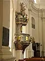Проповідальниця (і кіш, і балдахін) прикрашена різьбленими фігурами.