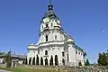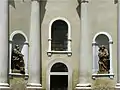 Споруда має багатий архітектурний декор. Фасад багато оздоблений бароковими елементами з пишними деталями. Завершується невеликим куполом у вигляді намету. В нішах встановлено кам'яні скульптури і вази.
