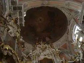 Внутрішній простір перекрито циліндричними склепіннми з люнетами. Склепіння середньої нави підтримується 8 масивними аркадами, хори над входом спираються на 4 аркади. Звід над пресбітерієм з головним вівтарем є сферичним; невисокий купол — «сліпий», без барабана і вікон, і ззовні його не видно.