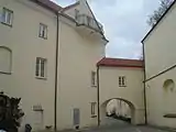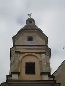 У центрі верхнього ярусу розташовується вікно, ошатно оформлене профільованими лиштвами і балюстрадою. З обох сторін розташовані парні іонічні пілястри і високі волюти. Фасад увінчаний високим трикутним фронтоном з гербом роду Паців у центрі. Замість веж по кутах - стрункі обеліски, що додатково підкреслюють спрямованість вгору.