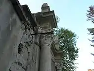 Портал костелу прикрашено прямим сандриком та гербом Потоцьких — Пилявою і текстом: