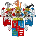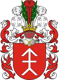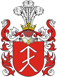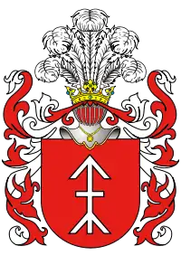 На червоному полі зображення стріла, направлена вгору і перехрещена посередині, з роздвоєним кінцем. Клейнод — над верхом з шляхетської корони 3 страусиних пера.