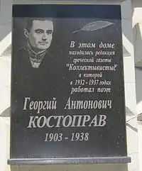 6 листопада 2003 року на честь 100-річчя від дня народження поета в Маріуполі на будівлі колишньої редакції газети «Колехтивістис» по проспекту Леніна, 35[4], урочисто відкрито пам'ятну дошку на честь Георгія Костоправа за участі фонду «Меморіал» та Федерації грецьких товариств України[5].
